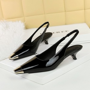 5312欧米風ファッション宴会細と浅口の女性靴の漆の皮の明るい顔の金属の頭の後ろの絆はやせている靴の女性を現します。