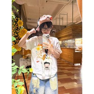 香港スタイルのプリント半袖Tシャツ、甘くてクールなルーズコットン半袖Tシャツ、女性用ジェンダーレスサマーユニフォーム