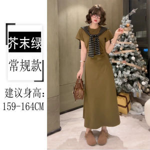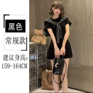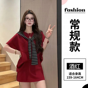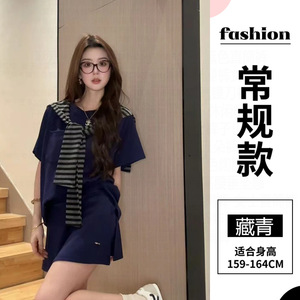 女性用韓国風ドレススーツ、夏用半袖ラウンドネックスカート、ファッショナブルでスリムなレイジースタイルストライプショールロングスカート