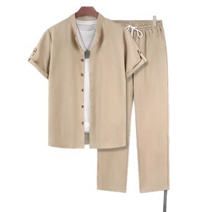 中高年ホーム服対外貿易新作春夏メンズ半袖シャツズボンスーツメンズカジュアルスタンドカラーシャツ