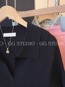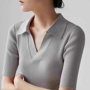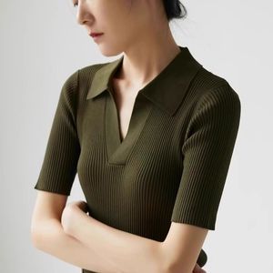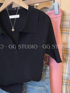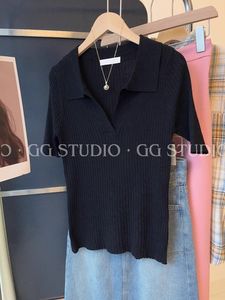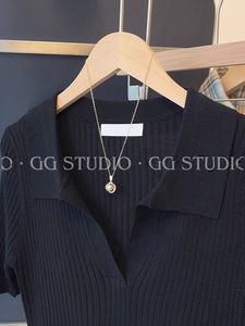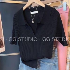 法式黑色polo领冰丝针织短袖t恤女夏季修身别致v领锁骨正肩上衣薄