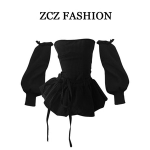 一字肩黑色袖套抹胸连衣裙女夏季蝴蝶结纯欲短裙收腰蓬蓬花苞裙子