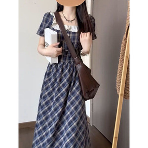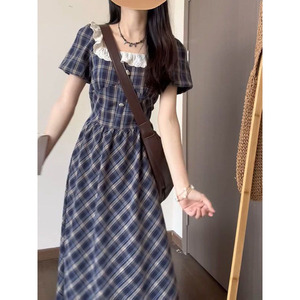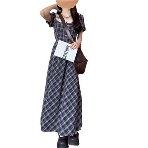 甘くて爽やかなスーパーフェアリーブルーのチェック柄ドレス、ウエストを絞った夏の初恋の優しいスタイル、スリムなAラインスカート
