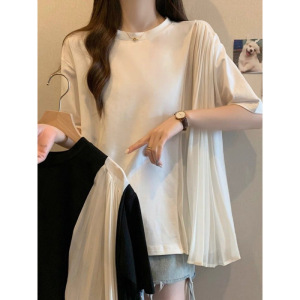 纯棉大码夏季小众遮肚子撞色短袖T恤女胖妹妹宽松显瘦不规则上衣
