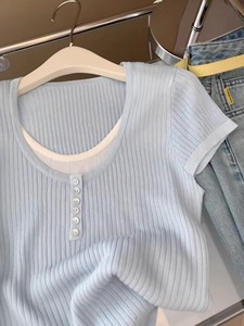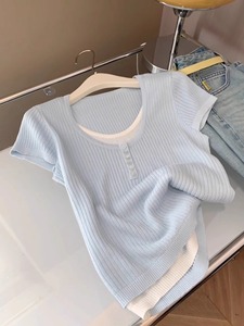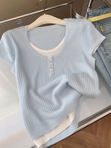 青い優しい風の偽の2つのニットの半袖のtシャツの女性の夏の2025新型の韓系の大衆のU襟の正肩の上着