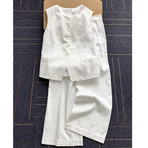 小香風高級感白色スーツ女性2025年夏の新型亜麻馬甲ベストワイドパンツ2点セット