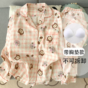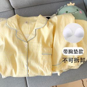 Yunduo 純綿パジャマ胸パッド付き女性の春と秋の長袖ズボン甘い黄色のチェック柄女の子ホーム服 2 点セット