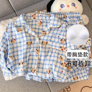 (固定胸パッド) 【Yunduomian】ダックスブルーチェック長袖+ズボン