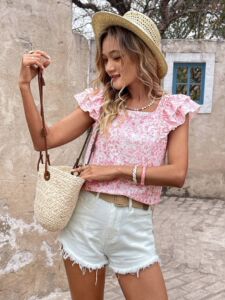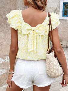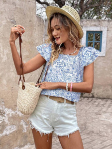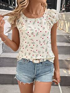 フラワーリボンショート半袖夏新作レディーストップクロスボーダーヨーロッパとアメリカのフレンチプリント気質半袖