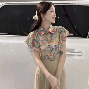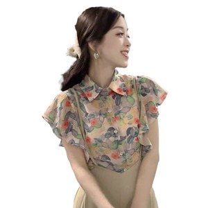 人気の爆発的なシフォンのプリントシャツの女性の夏の金はゆったりとしています。