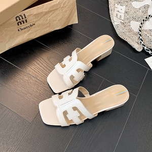 女性用スリッパ、夏用アウターウェア、本革厚底サンダル、新しいファッションネットセレブスクエアヒール、ローマンスリッパ