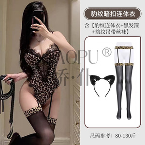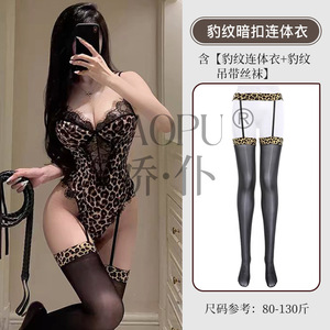 セクシーなヒョウ柄レースサスペンダージャンプスーツ、セクシーなハイカット、露出ヒップと胸、ホットなナイトクラブスタイルの情熱的な制服パジャマ