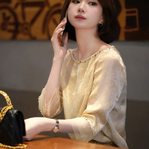 新しい中国風の軽い豪華な気質の年齢を減らす西洋スタイルの女性用シャツ 2025 ハイエンドの黄色の美しいユニークなトップ