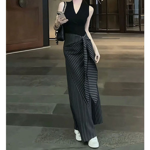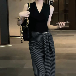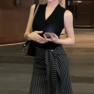 フレンチスタイルデザインクロスVネックニットベストレディース夏ハイウエストスリムイレギュラースカートスーツ