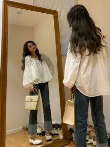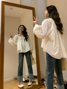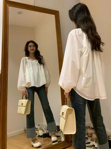 大きいサイズの卸売スクエアカラーパフスリーブシャツ女性のための春と秋の新しい韓国スタイルの無地ルーズハイエンド長袖トップ