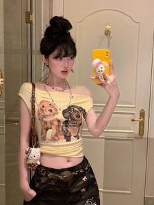 Pure Lust ワンショルダー パピープリント 半袖 Tシャツ レディース 夏 スリムフィット シックで美しいショートトップス イン