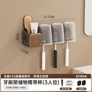 ブラックウォールナット-4人用歯ブラシホルダー-透明縦型カップ