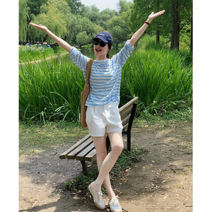 韩系蓝色条纹长袖防晒T恤女夏季小个子宽松外搭薄款空调罩衫上衣