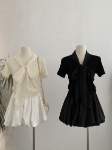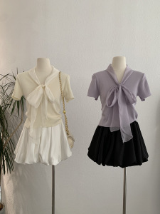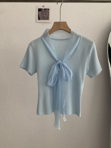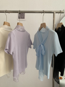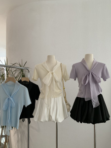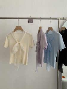 Omalai リボンストラップ無地スリムフィットショートショルダー半袖セータートップ韓国スタイル 3453