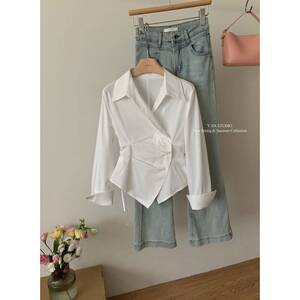 2025春夏の韓国版デザイン感シャツの女性ファッションの新型は腰を収めて流行しています。