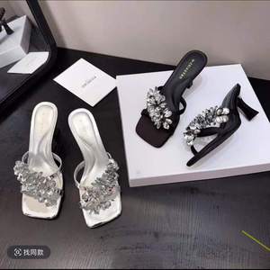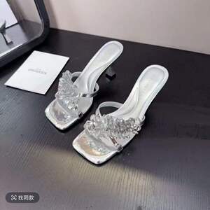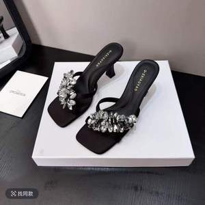 女性用ラインストーンフラワーオープントゥハイヒールスリッパ、2025新しいスタイルの厚いヒール、デイリー多用途スリッパ