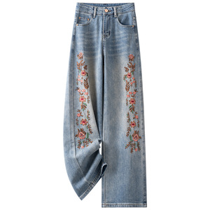 女性のための狭いバージョンのドレープ刺繍ジーンズワイドレッグパンツ 2025 夏の新しいハイウエストスリムストレートパンツ薄いスタイル