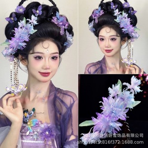 古代風蝶ヘッドドレス、紫色の古代風ヘアアクセサリー、漢服ホットフラワーヘアピン、シルクフラワー、新しい古典舞踊紫色のヘアアクセサリー