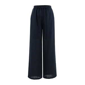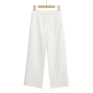 軽やかな薄い亜麻の広い足のカジュアルなズボンの女性2025夏のタイプの快適な狭い腰の頭は縄を引いてだらだらしています。