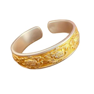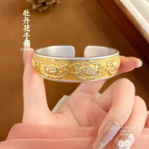 足银9999牡丹花开口手镯轻奢小众宫廷纯银时尚百搭首饰送母亲礼物