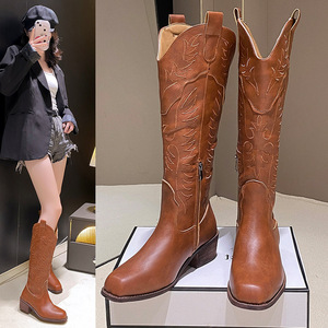 棕色靴子西部牛仔靴女2025春秋季长筒旅行穿搭v口长靴高跟骑士靴