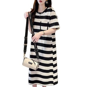 コントラストカラーストライプ半袖ドレスレディースサマードレス新しいルーズカジュアルレイジースタイル大きいサイズスリムロングTシャツドレス