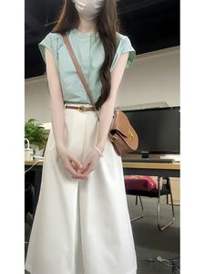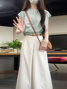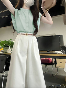 通勤用の夏服、シャツとスカートとベルトのセットを着て、エレガントに着こなすことができます。