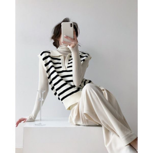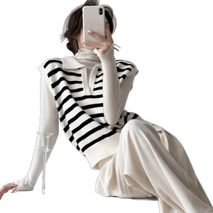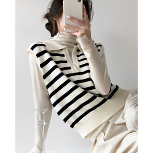 デザインニッチレトロルーズ乳白地黒ストライプクリーンレイヤードカラーニットベストトレンディ