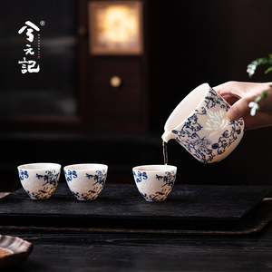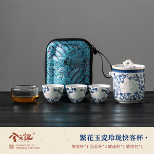 青と白の羊脂翡翠磁器絶妙な旅行ティーセット 1 人用屋外ポータブルクイックカップ 1 ポット 3 カップ