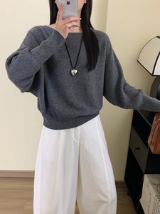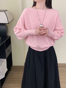 肉感たっぷり!リネンリヨセル素材で着痩せ効果のある、ワンラインネックのゆったりとしたドロップショルダー、バットスリーブのニットセーター。女性用プルオーバートップス、秋向け。