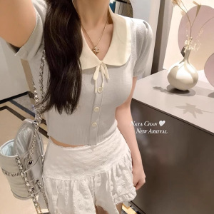 日本製ドールカラー半袖Tシャツ夏ショートセーターレースアップリボン年齢軽減スリムフィットトップ