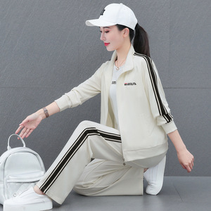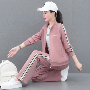春秋立领撞色时尚休闲运动套装女中年妈妈直筒开衫卫衣卫裤三件套