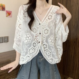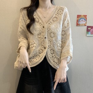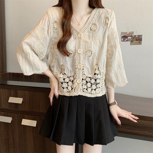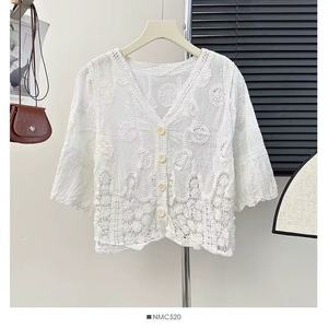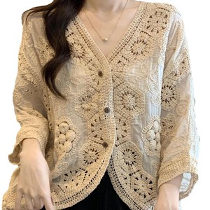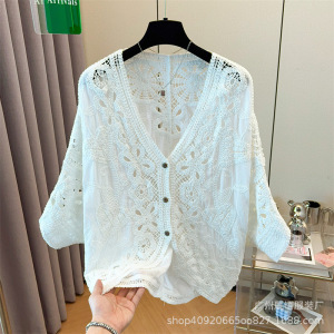 2025年の春夏の新型の洋気vネックの切り花の透かし彫りのカーディガンのレースのブラウスの長袖の韓国版のゆったりしている日焼け止めの服