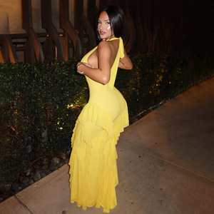 INS スタイルのヨーロッパとアメリカの夏の女性のノースリーブバックレス V ネックホルターネックストラップ気質フリルロングドレスクロスボーダー