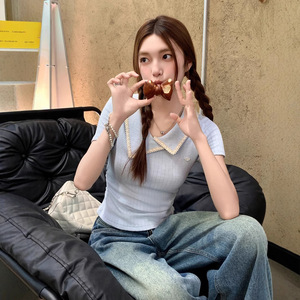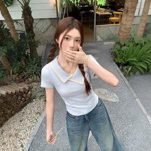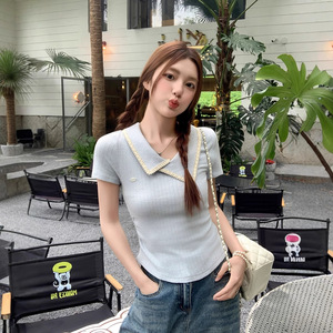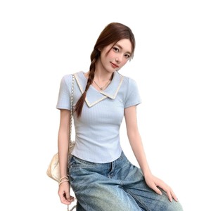 不規則なラペル半袖 T シャツ女性のための夏 2025 新しいデザインプリーツウエスト痩身右肩ショートトップ