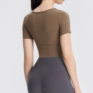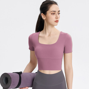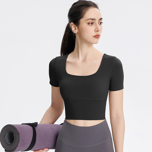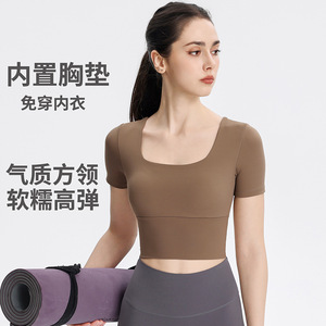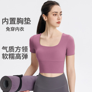 Uネックフィットネストップス、ランニングスポーツ、胸パッド付きヨガウェア、半袖、女性用春夏ピラティストレーニング