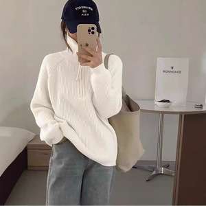 女性用の秋冬のピットハーフジップセーター、スタンドアップカラー、柔らかくワックスのようなルーズなレイジースタイルのアウターウェアニットセータートップ