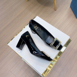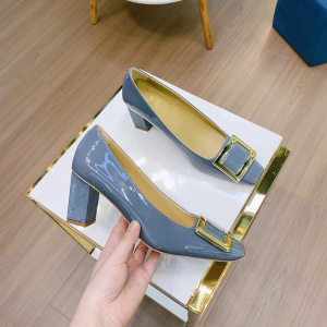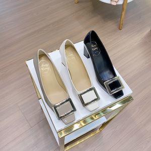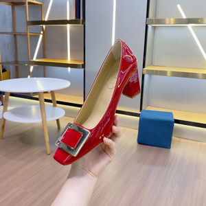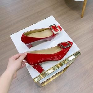 スクエアバックルパテントレザーハイヒール 2025 新しいスクエアトゥ浅い口メタルバックルファッショナブルな気質厚いヒールの女性の靴