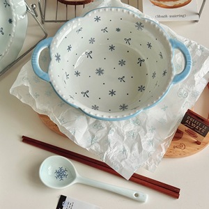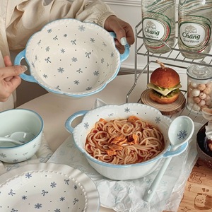 高颜値レース陶磁器双耳大容量スープ碗釉薬下彩家庭用大型デザート碗サラダ碗果物碗