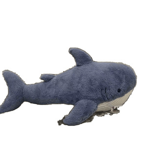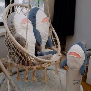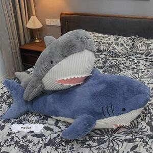 ネットの赤いかわいいサメは寝て枕のぬいぐるみのベッドの上でクッションの人形のぬいぐるみの女性の誕生日プレゼントを抱いています。