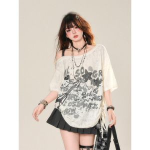 甘くてクールなホットガールロックキティ猫落書きストラップ半袖Tシャツレディース夏ルーズオフショルダートップブラウス