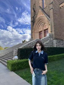 韓国レトロフェイクツーピースショルダー半袖Tシャツレディースパッチワークチェック柄ポロシャツ夏ルーズカレッジスタイルトップ