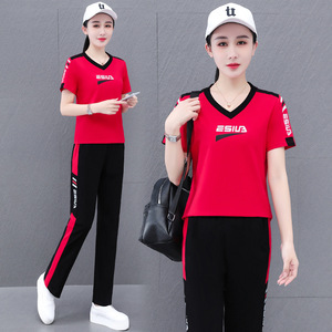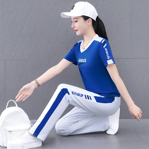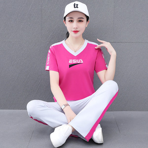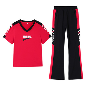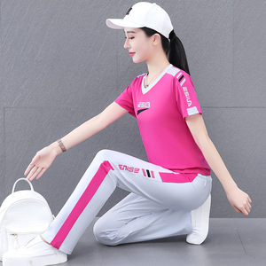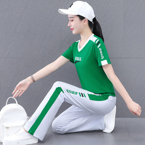 綿95 VネックTシャツカジュアルスポーツスーツレディース半袖夏新作スクエアダンス衣装ダンススタイル2点セット