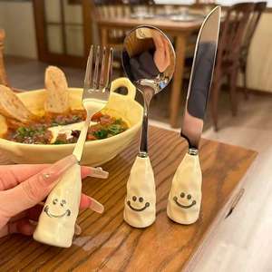 ステンレスナイフフォークスプーン高颜値不规则手握り感クリーム笑颜ハンドル洋食ナイフフォークスプーンデザートフォークスプーン