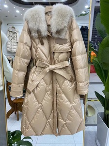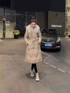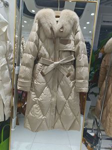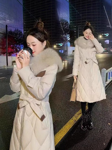 人気の大きなファー襟付きダウンジャケット、女性用、ウエストシェイプ、ファッショナブルでスタイリッシュなミドル丈、膝丈以上、厚手で暖かいコート、エレガントな雰囲気